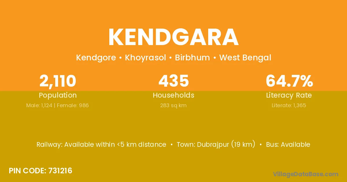 Dubrajpur (19 km) is the nearest town to Kendgara village for major economic activities and is located approximately 19 km away.