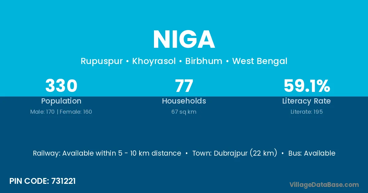 Dubrajpur (22 km) is the nearest town to Niga village for major economic activities and is located approximately 22 km away.