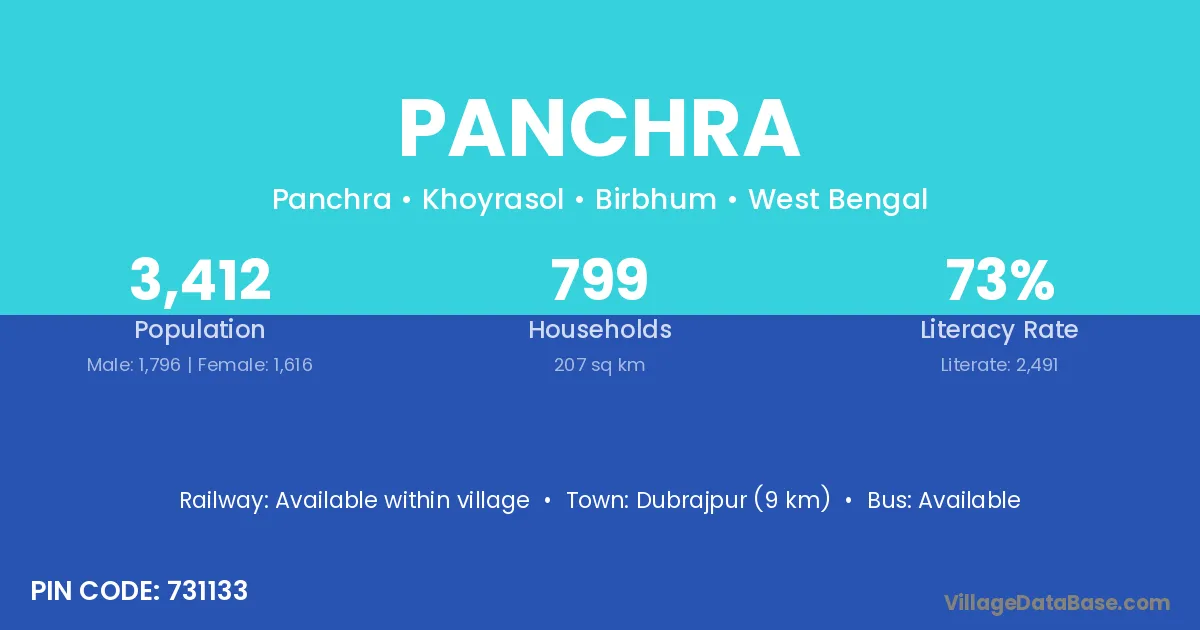 Dubrajpur (9 km) is the nearest town to Panchra village for major economic activities and is located approximately 9 km away.