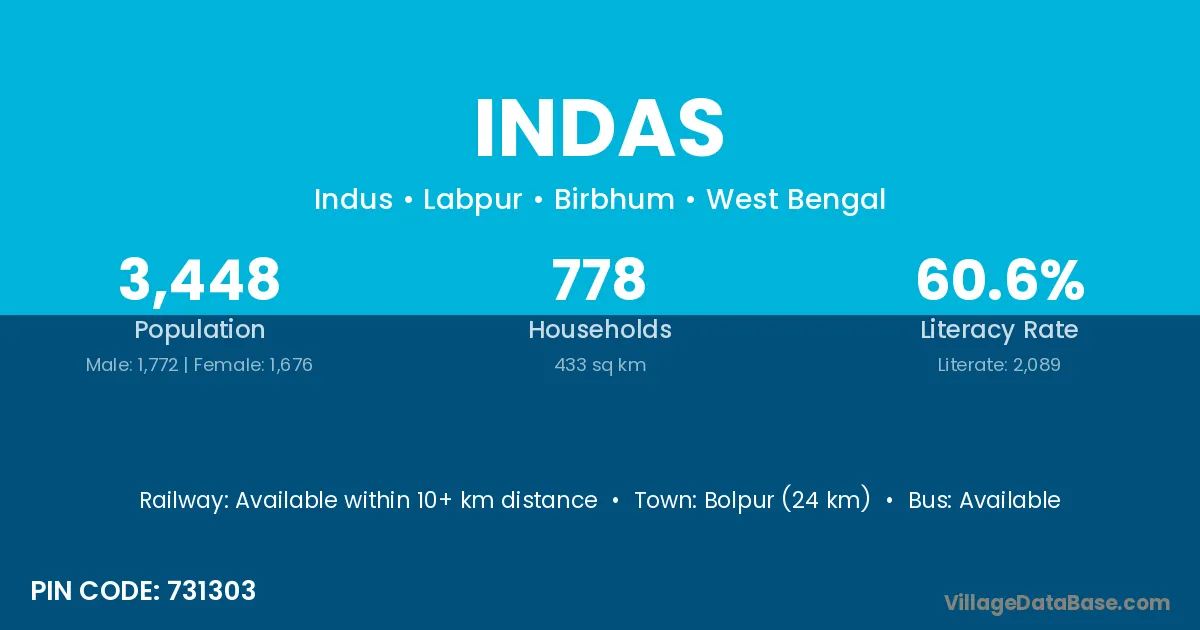 Bolpur (24 km) is the nearest town to Indas village for major economic activities and is located approximately 24 km away.