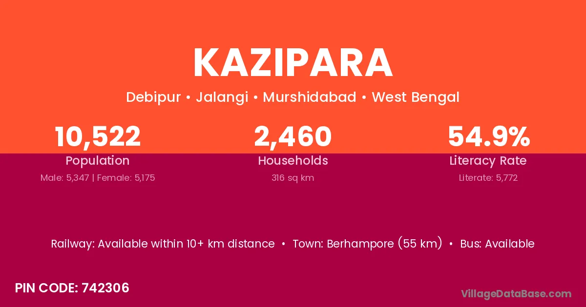 Bolpur (45 km) is the nearest town to Kazipara village for major economic activities and is located approximately 45 km away.