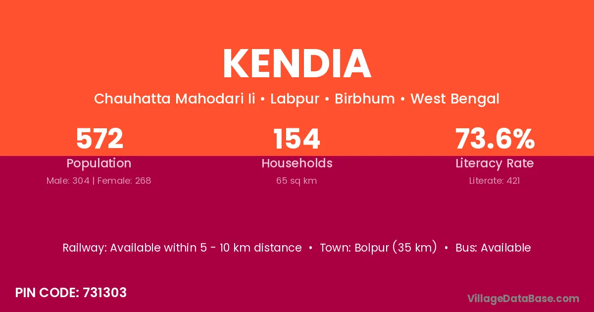 Bolpur (35 km) is the nearest town to Kendia village for major economic activities and is located approximately 35 km away.