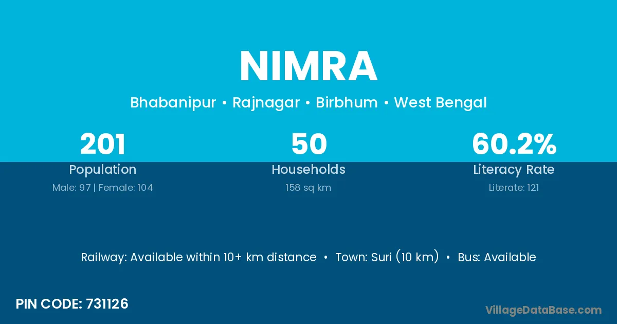 Bolpur (30 km) is the nearest town to Nimra village for major economic activities and is located approximately 30 km away.