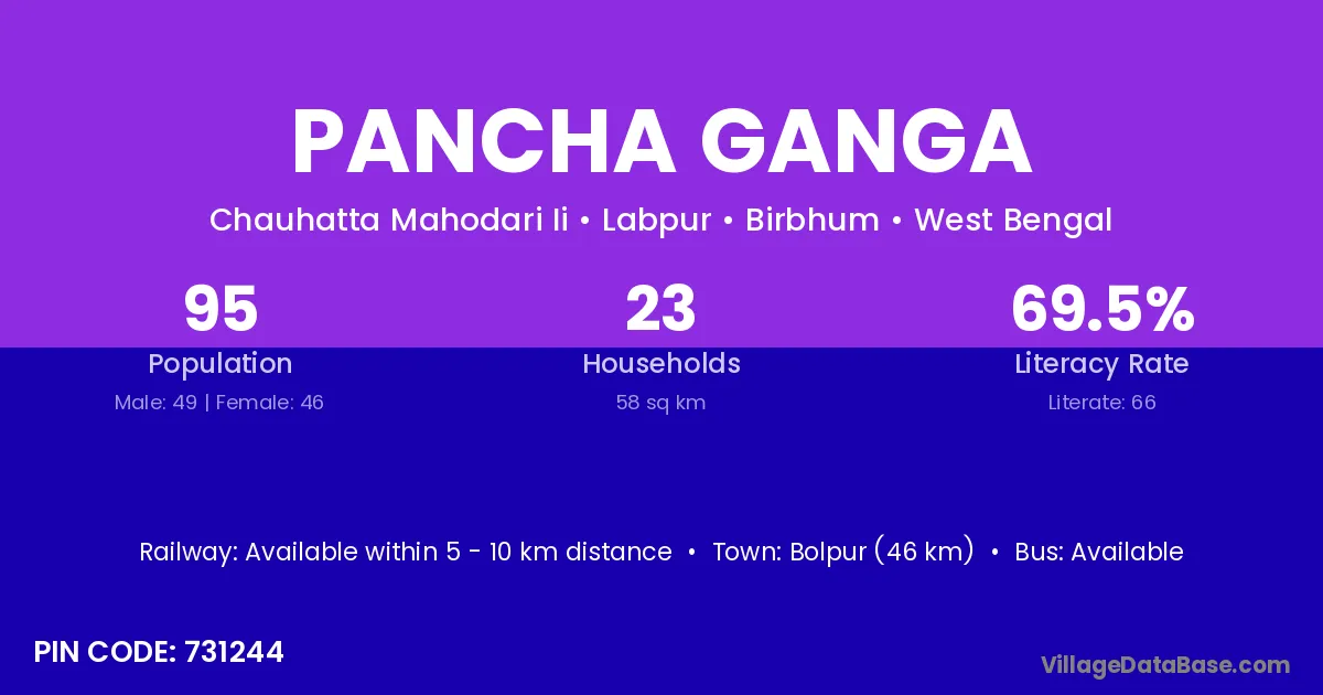 Bolpur (46 km) is the nearest town to Pancha Ganga village for major economic activities and is located approximately 46 km away.