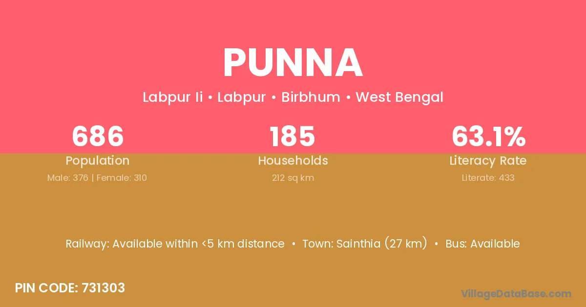 Sainthia (27 km) is the nearest town to Punna village for major economic activities and is located approximately 27 km away.