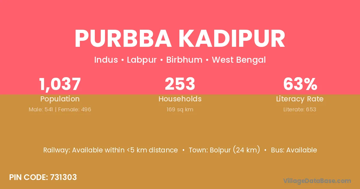 Bolpur (24 km) is the nearest town to Purbba Kadipur village for major economic activities and is located approximately 24 km away.