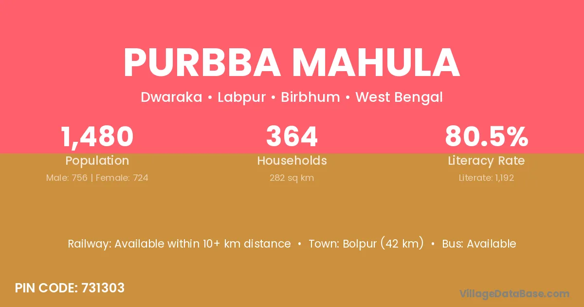 Bolpur (42 km) is the nearest town to Purbba Mahula village for major economic activities and is located approximately 42 km away.