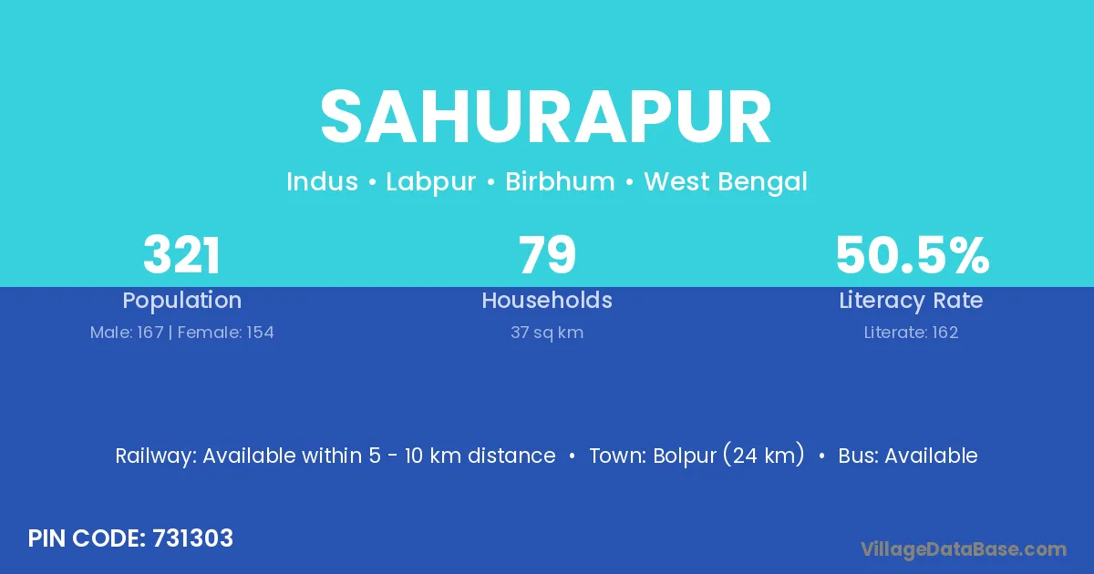 Bolpur (24 km) is the nearest town to Sahurapur village for major economic activities and is located approximately 24 km away.