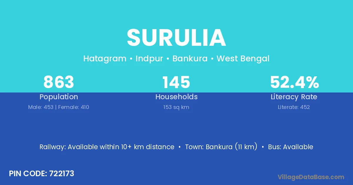 Bolpur (29 km) is the nearest town to Surulia village for major economic activities and is located approximately 29 km away.