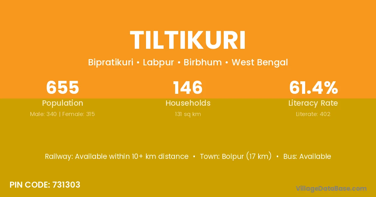 Bolpur (17 km) is the nearest town to Tiltikuri village for major economic activities and is located approximately 17 km away.