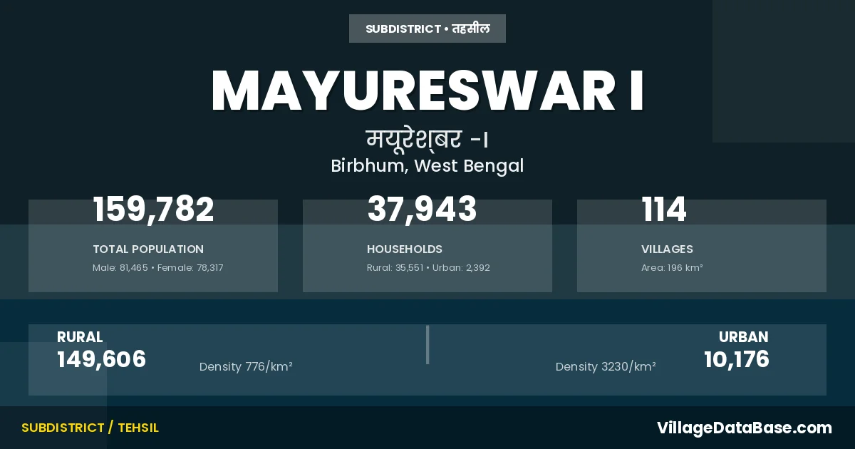 According to the 2011 census The total area of Mayureswar I Subdivision is 196 km², with a population of 159782 people. The population density is 816 inhabitants per square kilometre, and there are approximately 37943 houses in the sub district.