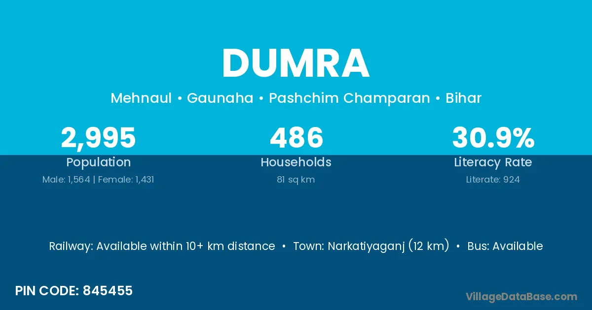 According to Census 2011 information, the village code of Dumra village is 731234.