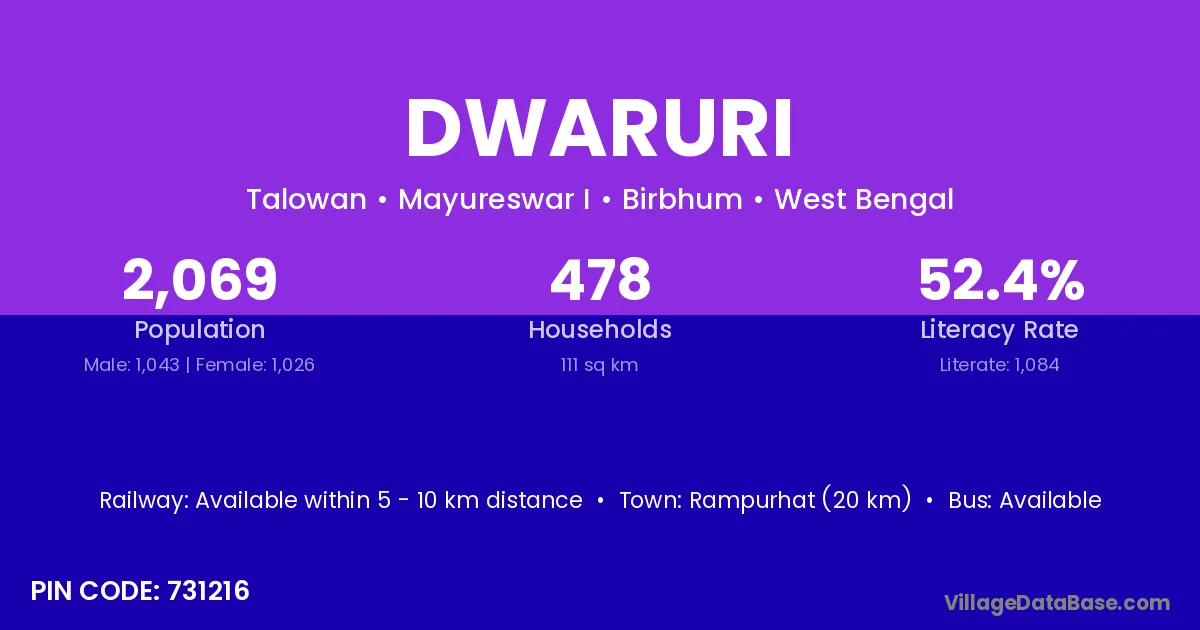 Rampurhat (20 km) is the nearest town to Dwaruri village for major economic activities and is located approximately 20 km away.