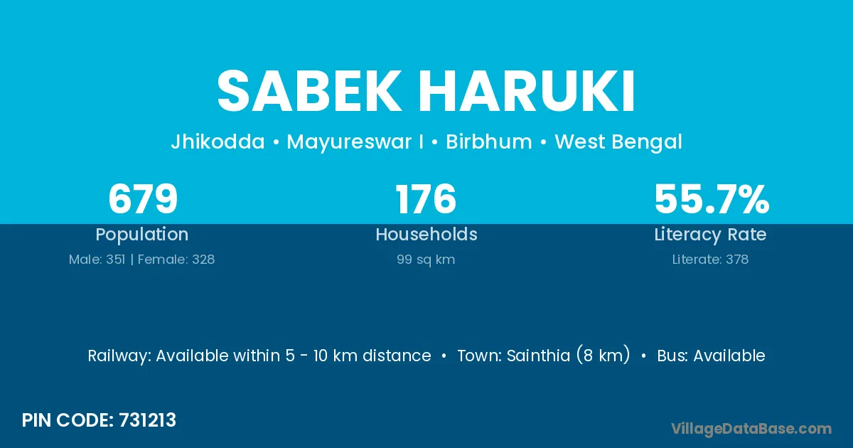 Sainthia (8 km) is the nearest town to Sabek Haruki village for major economic activities and is located approximately 8 km away.