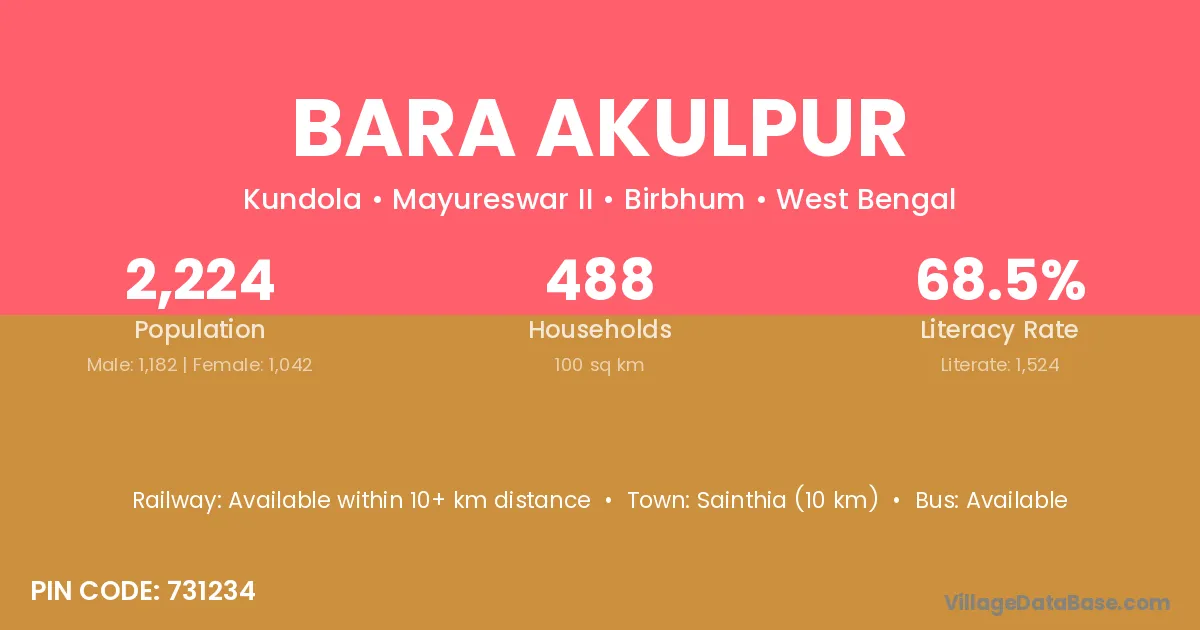Sainthia (10 km) is the nearest town to Bara Akulpur village for major economic activities and is located approximately 10 km away.