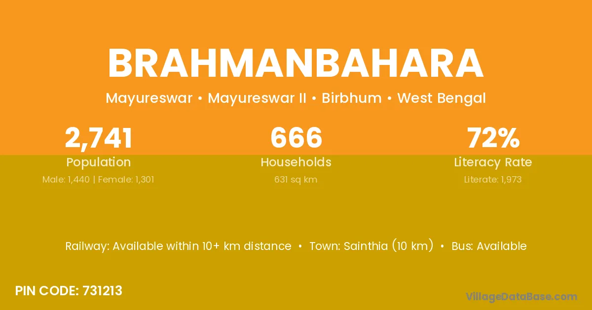 Sainthia (10 km) is the nearest town to Brahmanbahara village for major economic activities and is located approximately 10 km away.