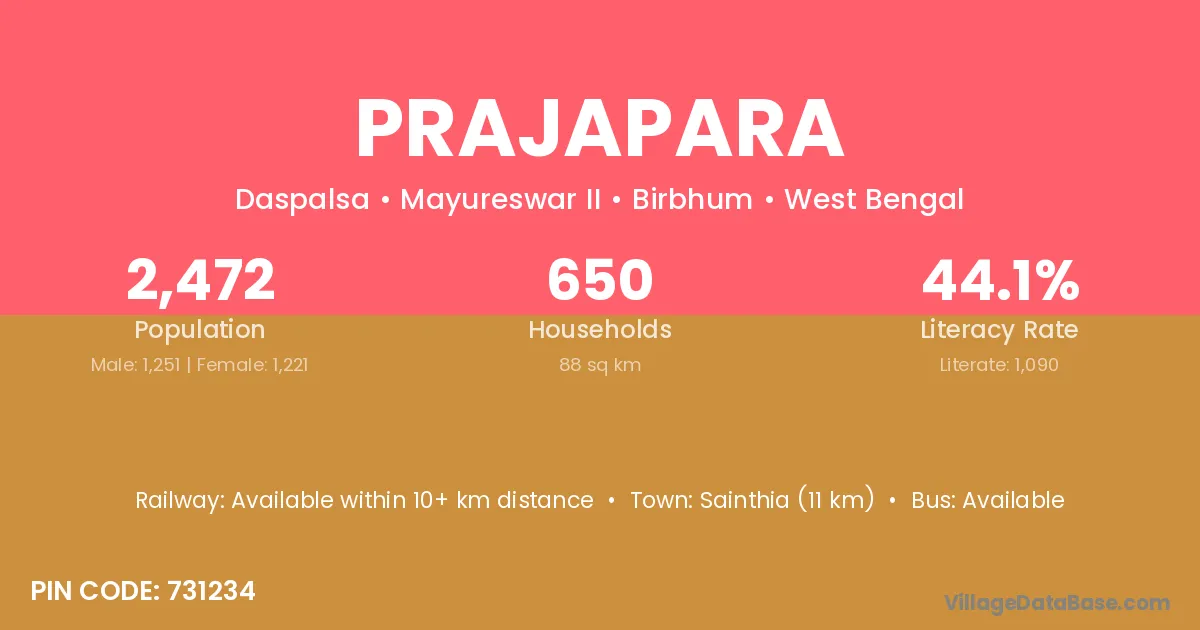 Sainthia (11 km) is the nearest town to Prajapara village for major economic activities and is located approximately 11 km away.