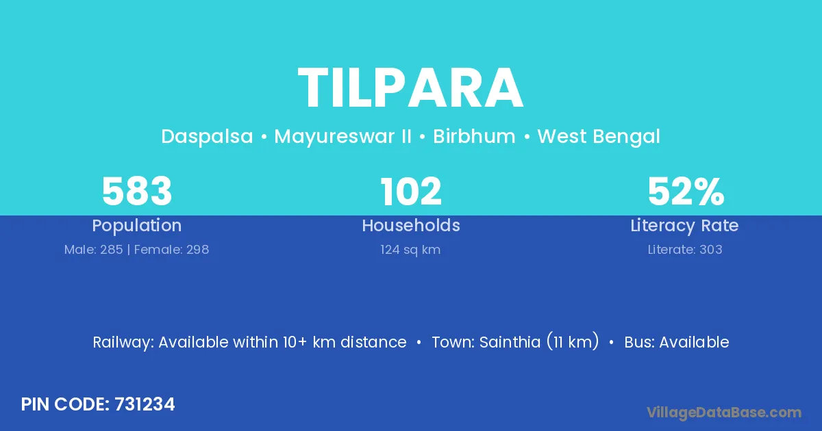 Sainthia (11 km) is the nearest town to Tilpara village for major economic activities and is located approximately 11 km away.