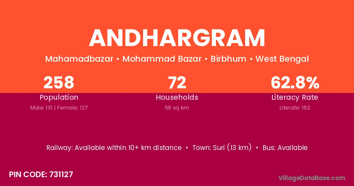Suri (13 km) is the nearest town to Andhargram village for major economic activities and is located approximately 13 km away.