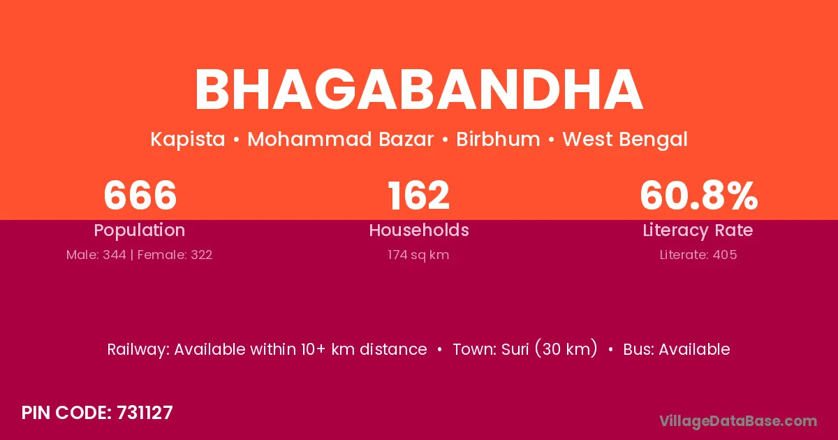 Suri (30 km) is the nearest town to Bhagabandha village for major economic activities and is located approximately 30 km away.