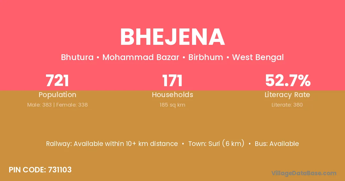 Suri (6 km) is the nearest town to Bhejena village for major economic activities and is located approximately 6 km away.