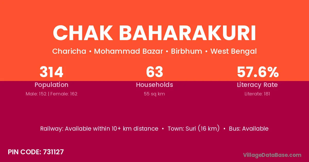 Suri (16 km) is the nearest town to Chak Baharakuri village for major economic activities and is located approximately 16 km away.