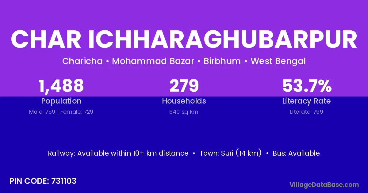 Suri (14 km) is the nearest town to Char Ichharaghubarpur village for major economic activities and is located approximately 14 km away.