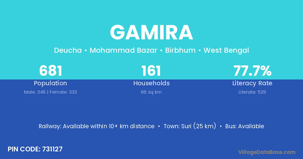 Suri (25 km) is the nearest town to Gamira village for major economic activities and is located approximately 25 km away.