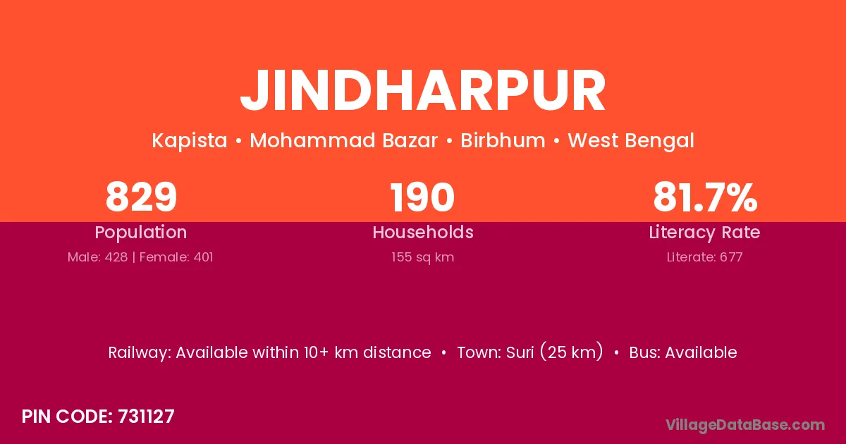 Suri (25 km) is the nearest town to Jindharpur village for major economic activities and is located approximately 25 km away.