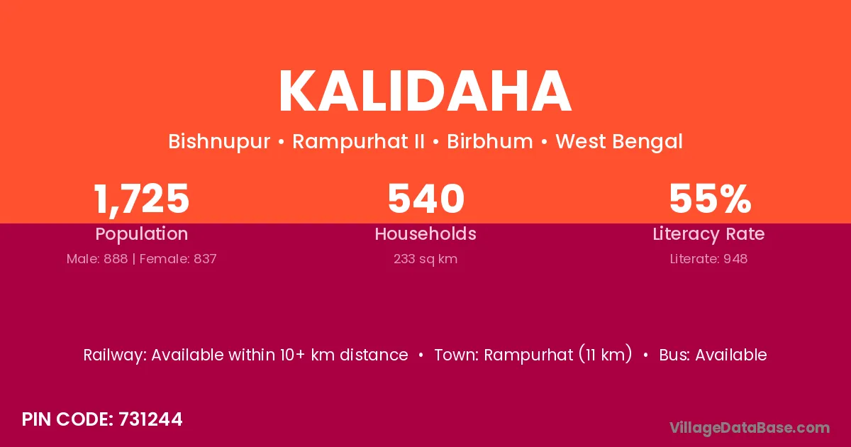 Suri (17 km) is the nearest town to Kalidaha village for major economic activities and is located approximately 17 km away.