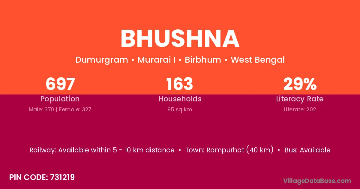 Rampurhat (40 km) is the nearest town to Bhushna village for major economic activities and is located approximately 40 km away.