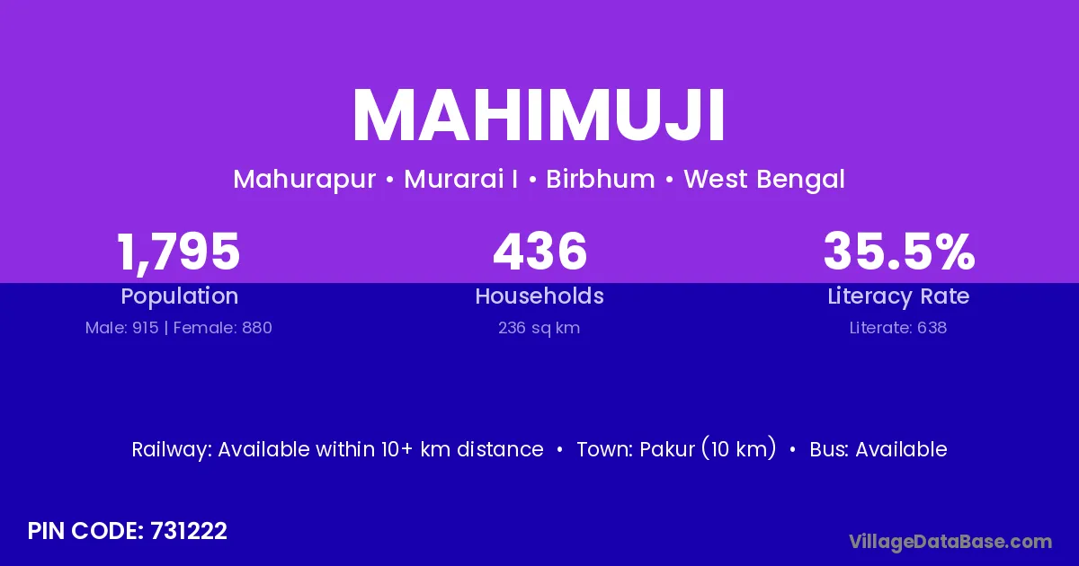 Pakur (10 km) is the nearest town to Mahimuji village for major economic activities and is located approximately 10 km away.