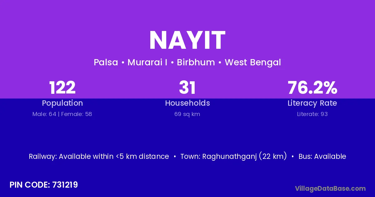 Raghunathganj (22 km) is the nearest town to Nayit village for major economic activities and is located approximately 22 km away.