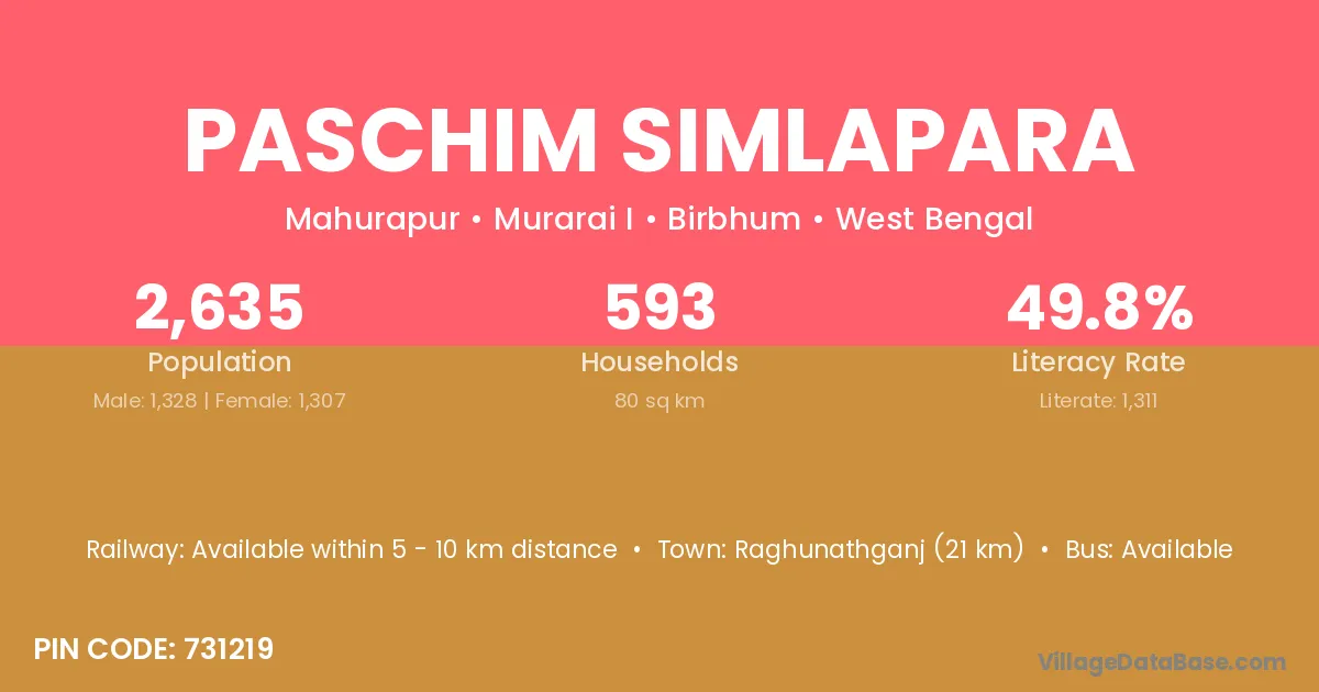 Raghunathganj (21 km) is the nearest town to Paschim Simlapara village for major economic activities and is located approximately 21 km away.