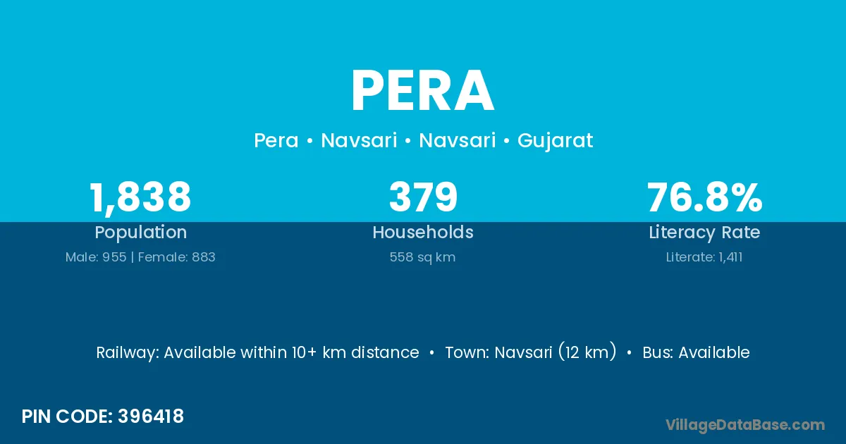 The literacy rate of Pera village is 49.75%. Male literacy stands at 55.95% and female literacy at 43.11%.