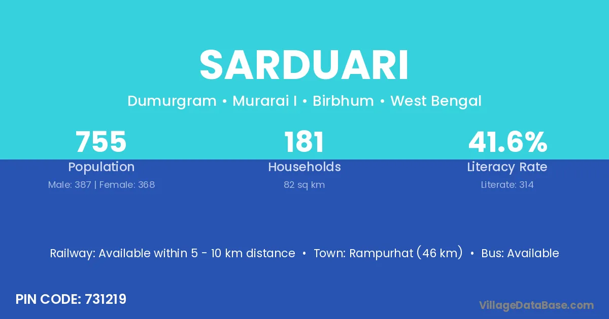Rampurhat (46 km) is the nearest town to Sarduari village for major economic activities and is located approximately 46 km away.
