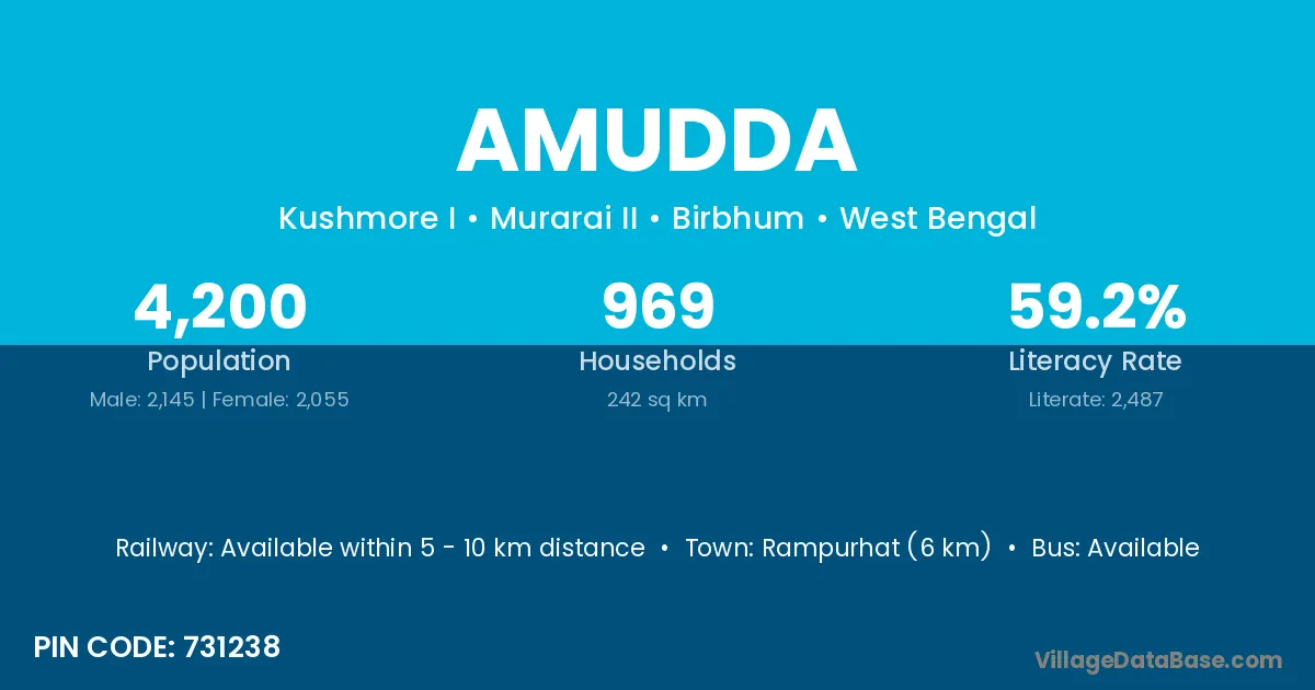Rampurhat (6 km) is the nearest town to Amudda village for major economic activities and is located approximately 6 km away.