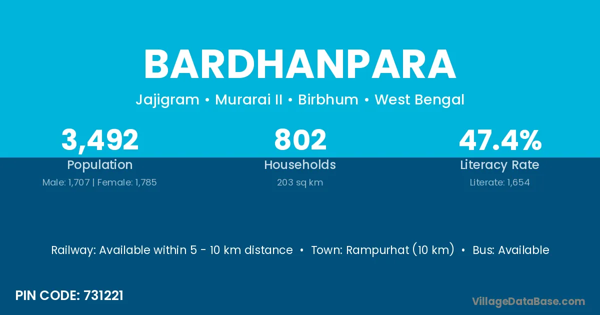 Rampurhat (10 km) is the nearest town to Bardhanpara village for major economic activities and is located approximately 10 km away.