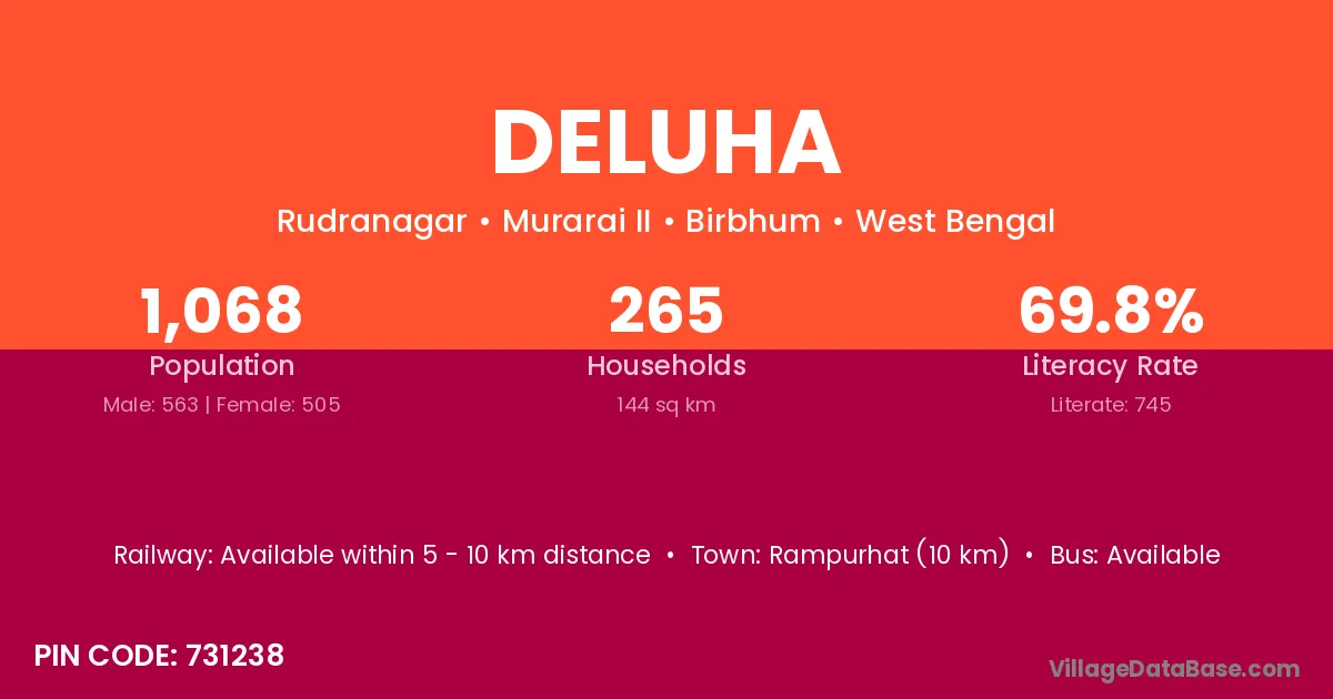 Rampurhat (10 km) is the nearest town to Deluha village for major economic activities and is located approximately 10 km away.
