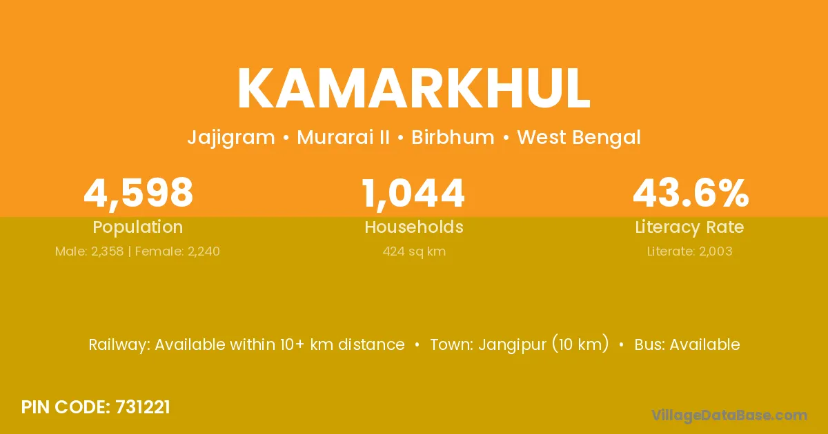 Jangipur (10 km) is the nearest town to Kamarkhul village for major economic activities and is located approximately 10 km away.