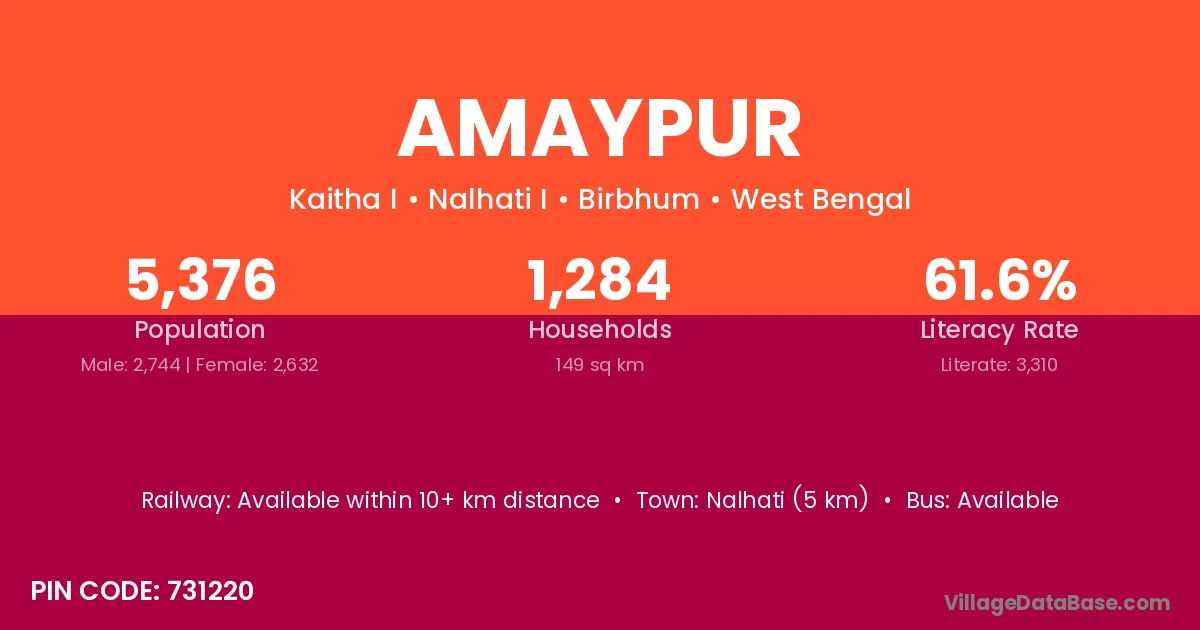 Nalhati (5 km) is the nearest town to Amaypur village for major economic activities and is located approximately 5 km away.