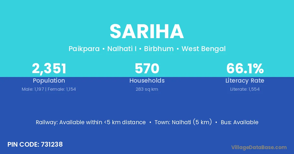 Nalhati (5 km) is the nearest town to Sariha village for major economic activities and is located approximately 5 km away.