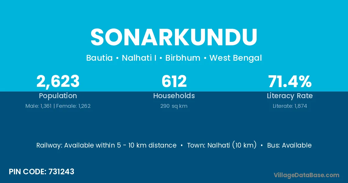 Nalhati (10 km) is the nearest town to Sonarkundu village for major economic activities and is located approximately 10 km away.