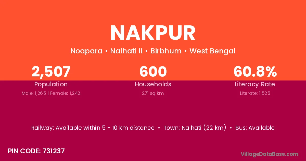 Nalhati (22 km) is the nearest town to Nakpur village for major economic activities and is located approximately 22 km away.