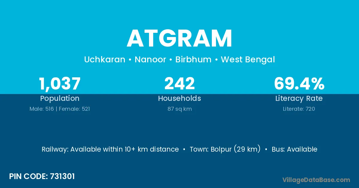 Bolpur (29 km) is the nearest town to Atgram village for major economic activities and is located approximately 29 km away.