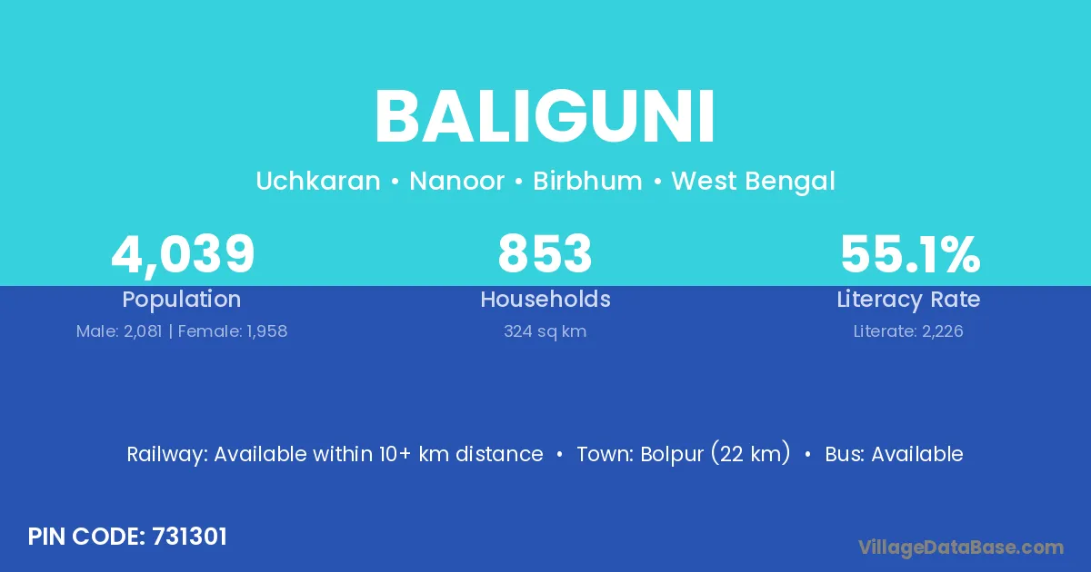Bolpur (22 km) is the nearest town to Baliguni village for major economic activities and is located approximately 22 km away.