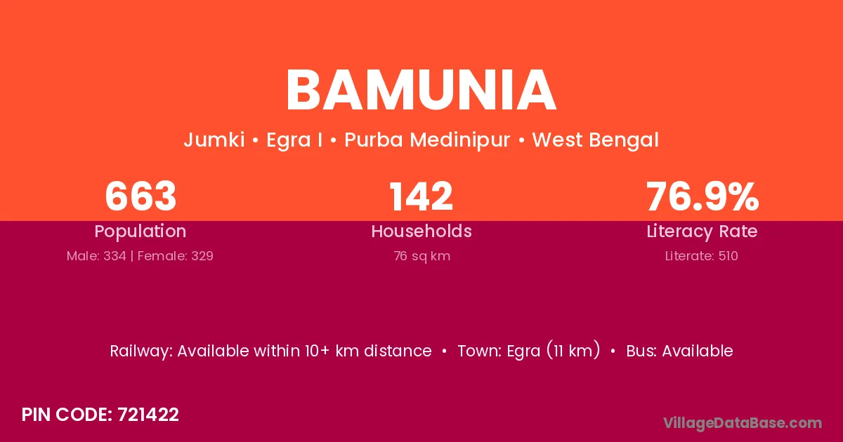 Bolpur (22 km) is the nearest town to Bamunia village for major economic activities and is located approximately 22 km away.