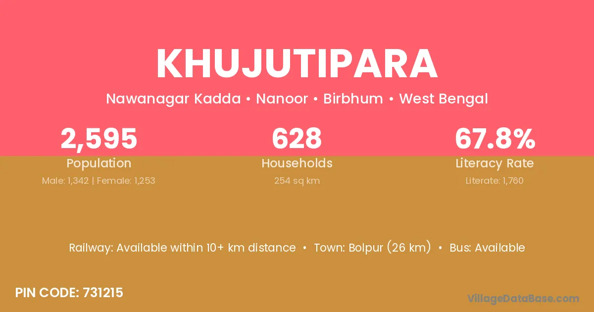 Bolpur (26 km) is the nearest town to Khujutipara village for major economic activities and is located approximately 26 km away.
