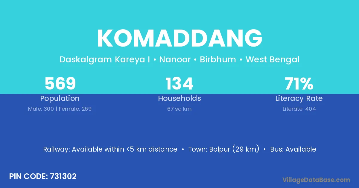 Bolpur (29 km) is the nearest town to Komaddang village for major economic activities and is located approximately 29 km away.