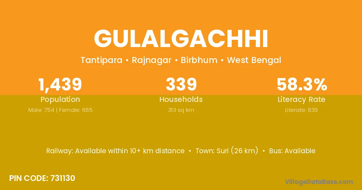 Suri (26 km) is the nearest town to Gulalgachhi village for major economic activities and is located approximately 26 km away.